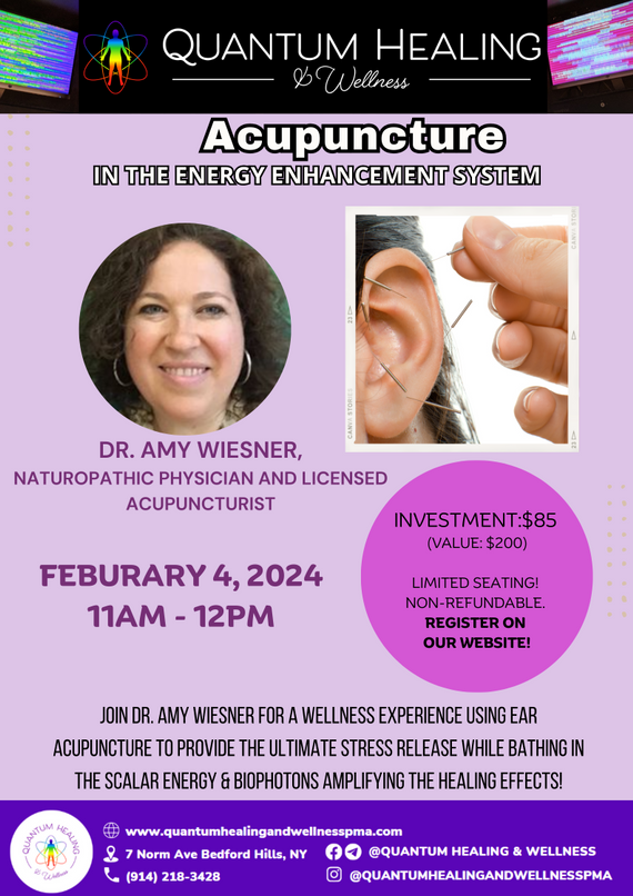 Combine multiple healing modalities to help you to feel your best and amplify the benefits! Dr. Amy Wiesner will provide ear acupuncture to help to balance your mind and body. Ear points will be chosen to help you to relax, to balance the sympathetic and parasympathetic nervous systems and to create a sense of well-being. Dr. Wiesner has been practicing Naturopathic Medicine and Acupuncture for over 20 years in Fairfield County, CT. She uses acupuncture, lifestyle medicine, nutritional supplementation and homeopathy to help her patients achieve health and well-being.