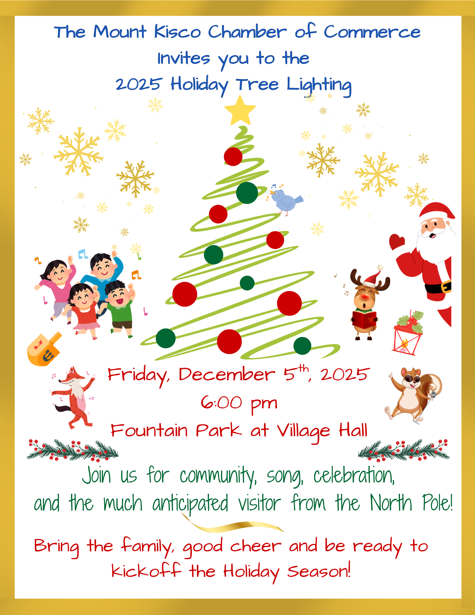 Join us for the 2025 Tree Lighting at Fountain Park at Village Hall. There will be community, singing, light refreshments, and a visit from a very special visitor from the North Pole! PLUS the exciting countdown to the lighting of the spectacular holiday tree. A family photo op with Santa and Mrs.Claus follows the program. All welcome - be sure to dress warmly!