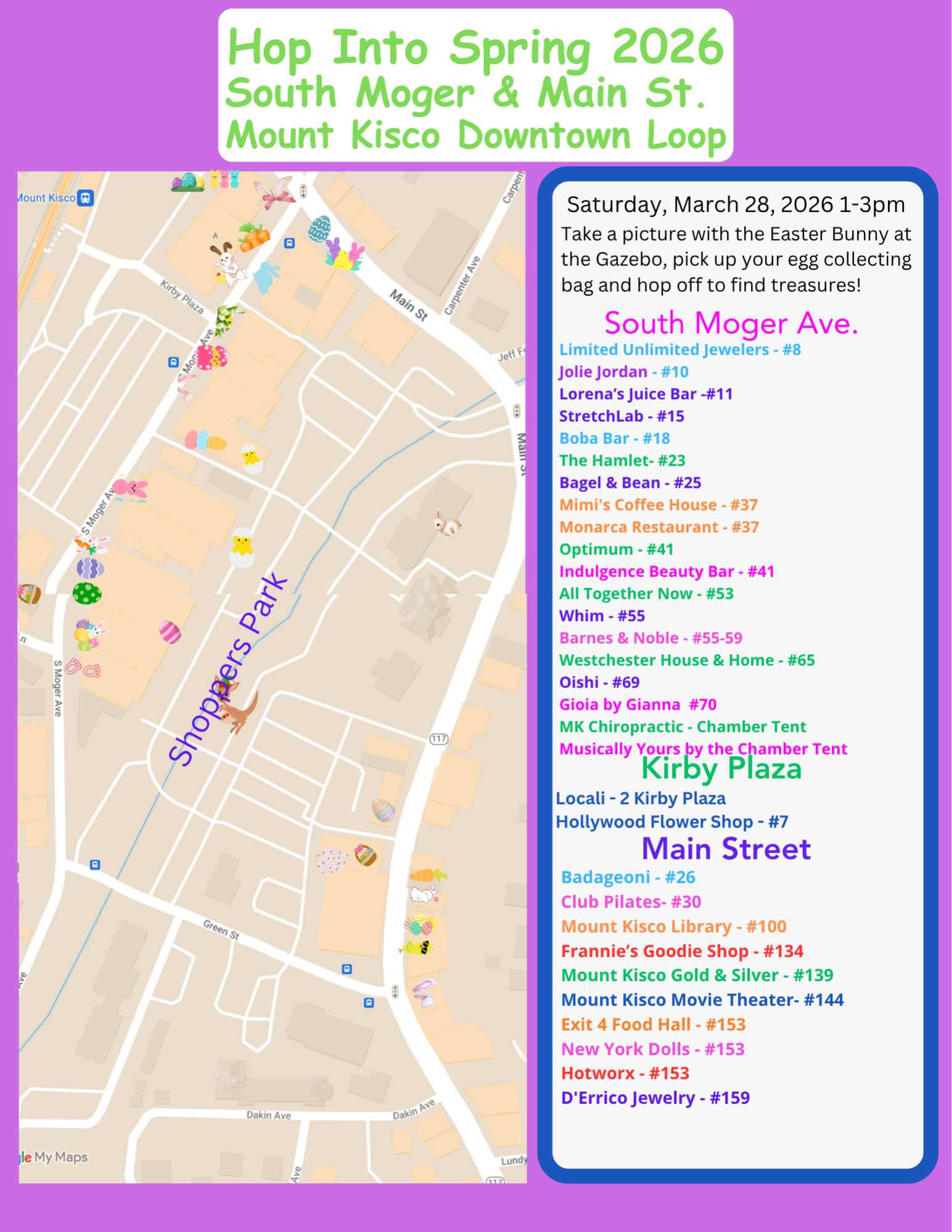 Bring the kids for this fun-filled Springtime annual event sponsored by the Mount Kisco Chamber of Commerce. Stop by the Gazebo on South Moger Ave. for a quick pic with "Bunny" and then grab a map and take the kids for a stroll along the downtown Egg Trail to visit our participating shops. While you are in town hop to your Springtime shopping, meet friends for lunch... enjoy the afternoon in Kisco!