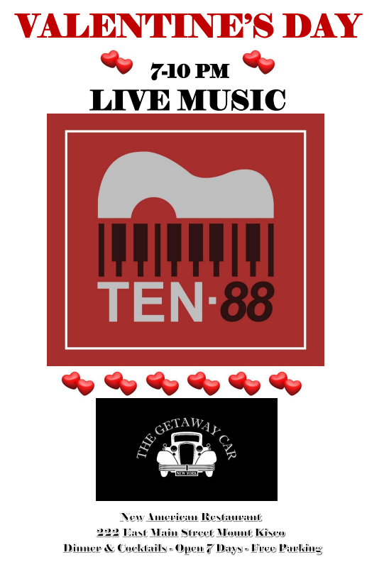 Valentine's Day, February 14, 2025 Enjoy Live Music by "Ten 88" while enjoying cocktails and dinner with your sweetheart at The Getaway Restaurant located at 222 East Main Street, Mount Kisco, NY (Free Parking in rear)