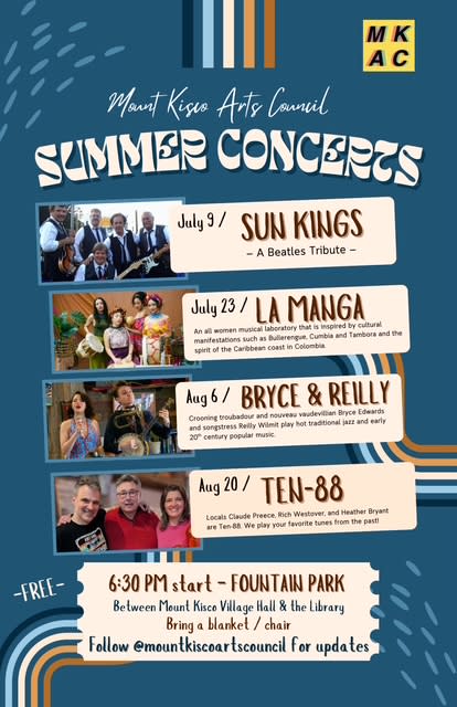 Bring a chair or blanket - picnicking encouraged! For Weather Issues: check the Mount Kisco Arts Council Facebook Page @mountkiscoartscouncil